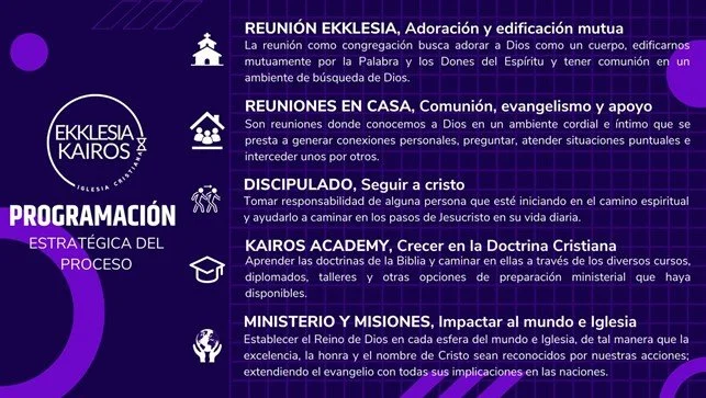 A partir de nuestro propósito se decide cada actividad semanal vital que la Ekklesia Kairos realizará desde diversos frentes o con esquemas diferenciados, esto se conocerá como la programación estratégica del proceso en la siguiente infografía: